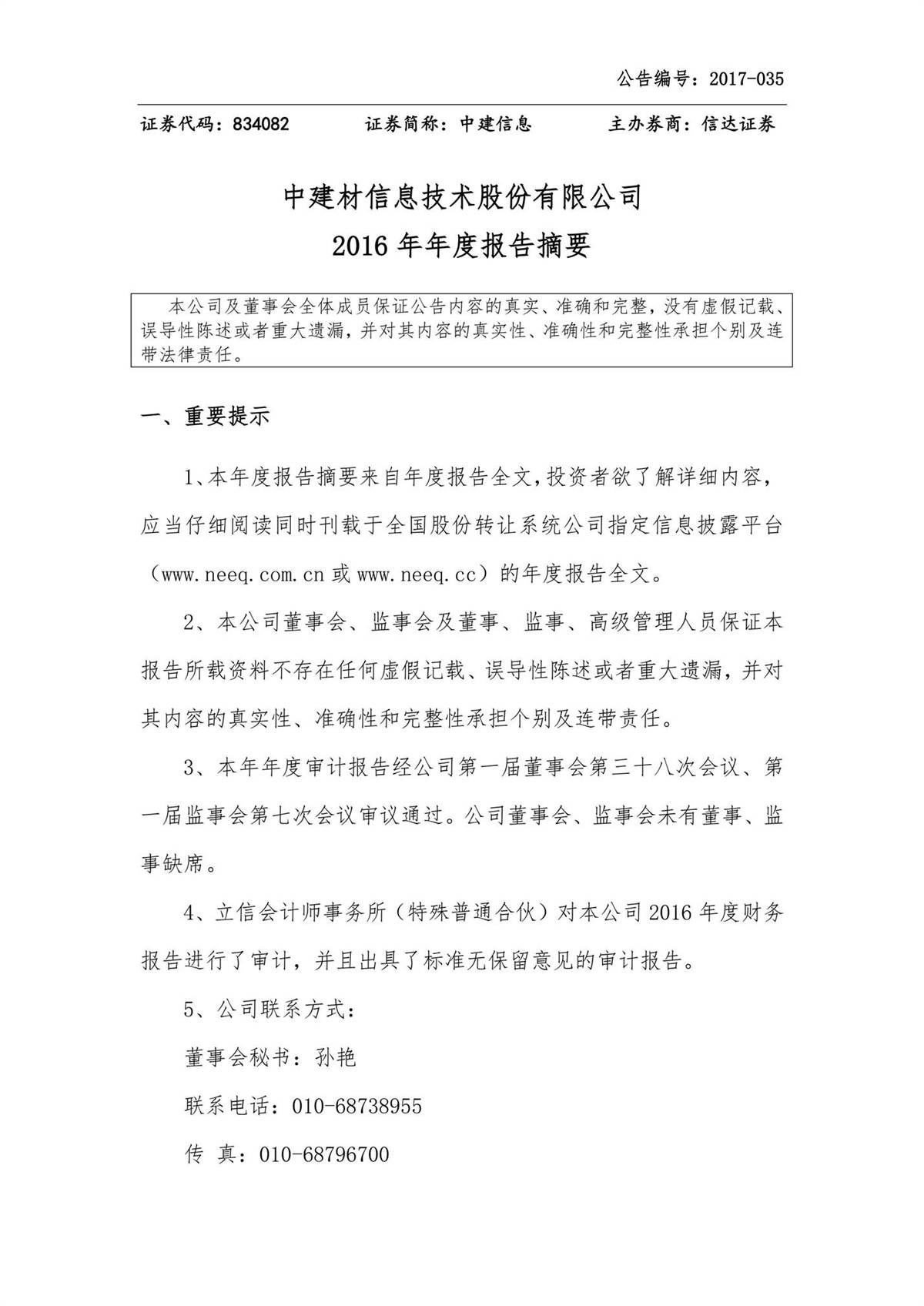 中建信息2016年年度報(bào)告摘要